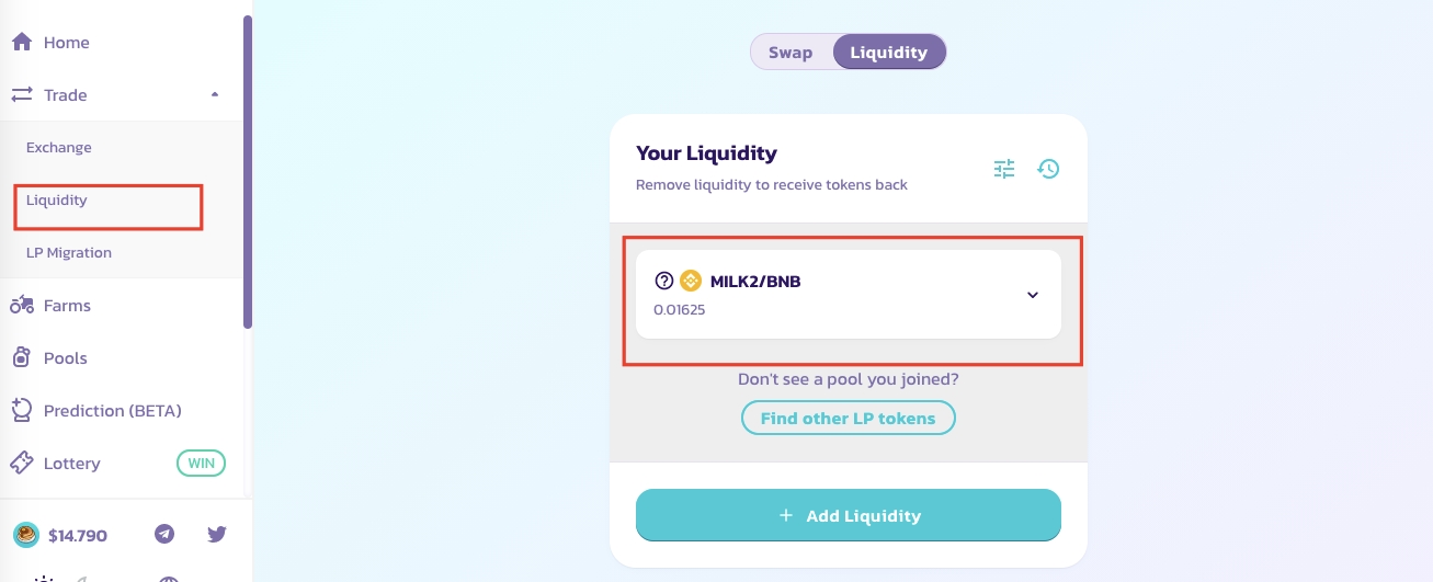 28. Go back to PancakeSwap and open the ‘Liquidity’ section. Here you’ll see your staked coins and the pool you’ve chosen.