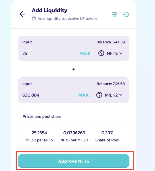 21. Choose the correct amount of NFTS and MILK2/BNB, then click on ‘Approve NFTS’.