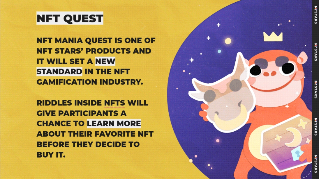 NFT Mania is a gaming platform through which we will integrate gamification into the NFT STARS ecosystem. NFT technology has largely embraced the gaming industry, so gaming will be an important element of the NFT STARS ecosystem. You can determine the potential of implementing gamification into our ecosystem by assessing NFT Mania Quest.
