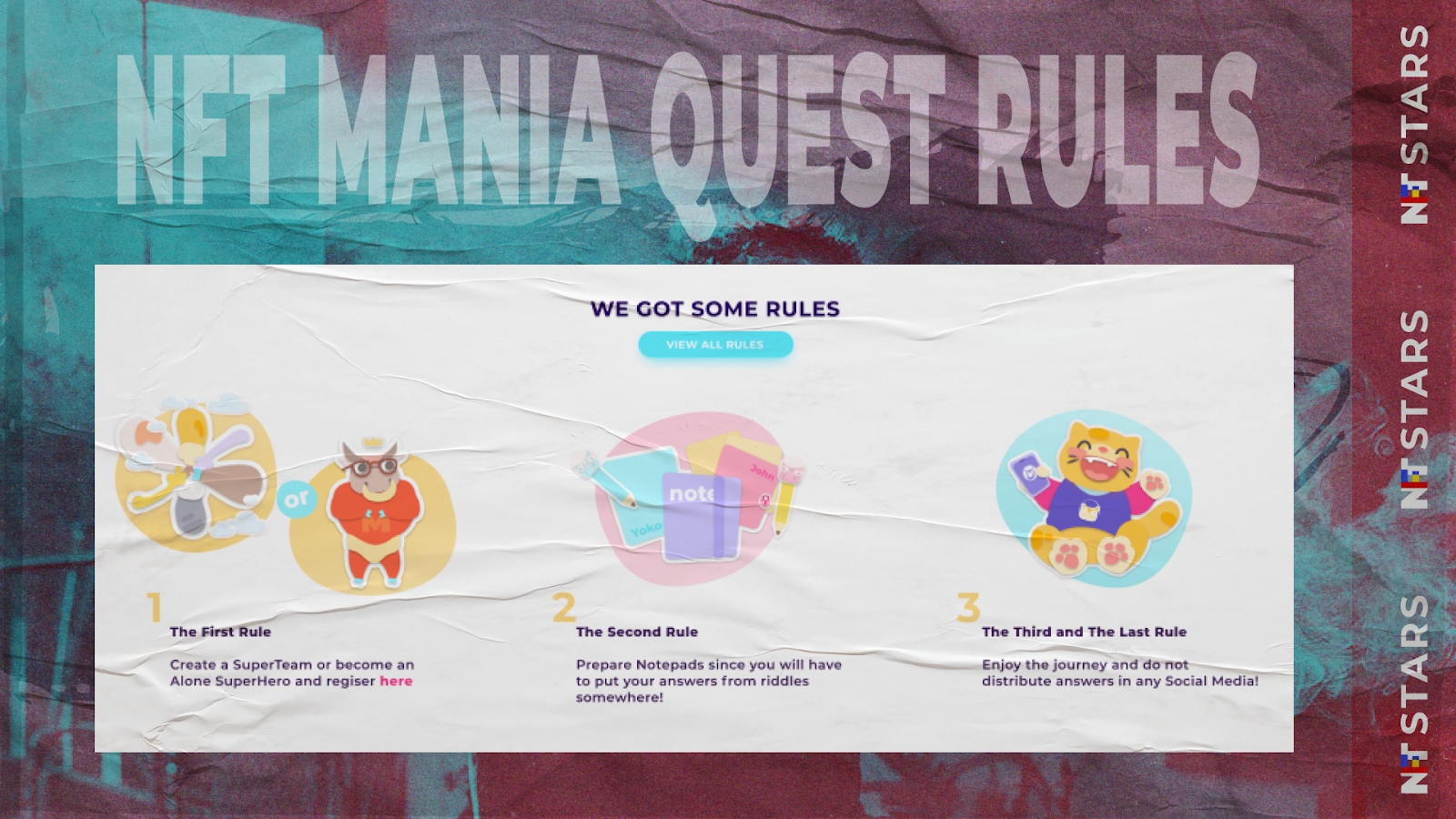 The NFT Mania Quest is one of NFT STARS’s quirky solutions. We organized this free entertainment event to acquaint our users with the NFT market and NFT STARS.